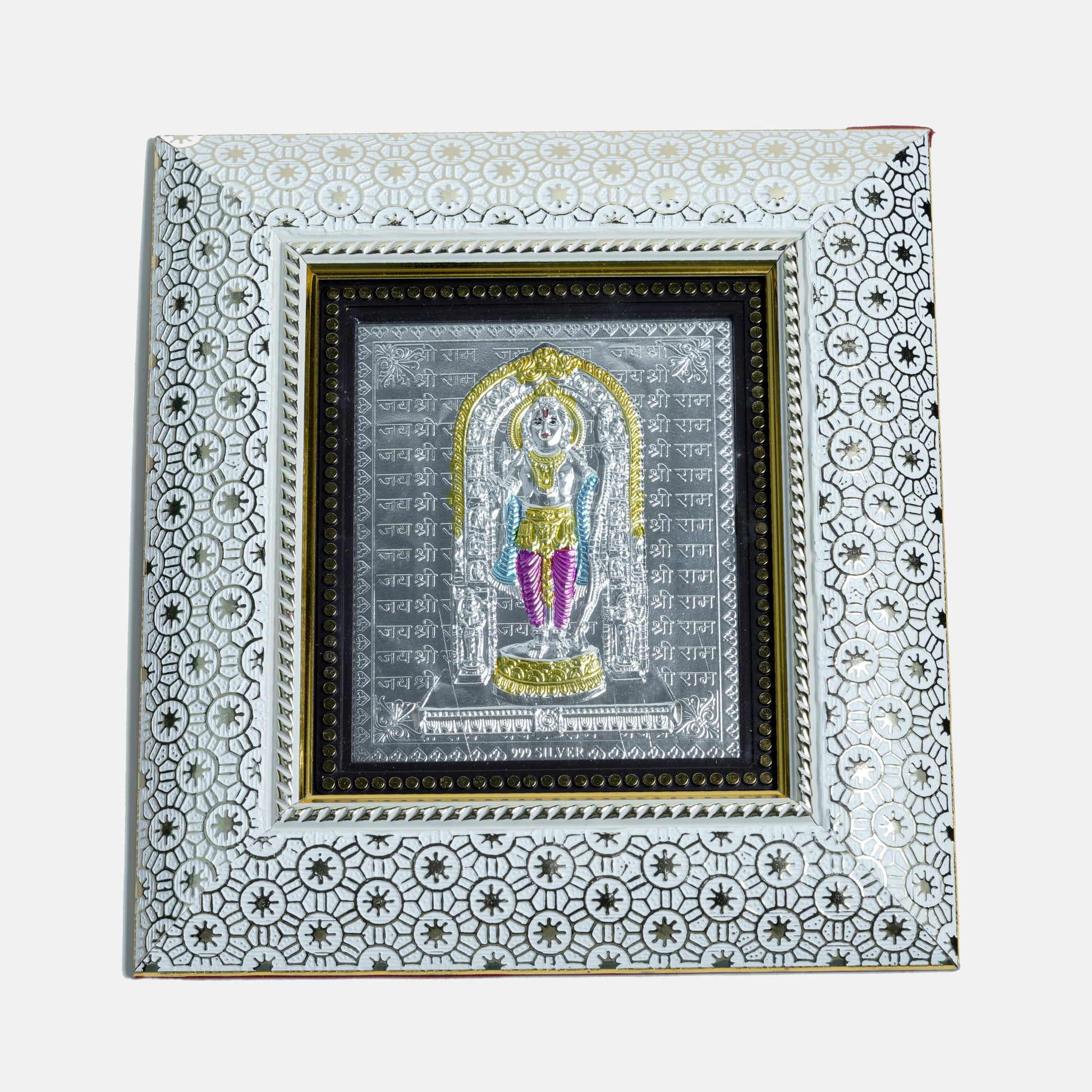 Bring divine blessings and timeless elegance to your space with this Shree Ram Silver Framed Wall Art from CHANDRIKA TALES. Crafted in 999 purity silver, the artwork features an intricately embossed image of Lord Shree Ram standing gracefully under a sacred arch, symbolising strength, righteousness, and devotion.