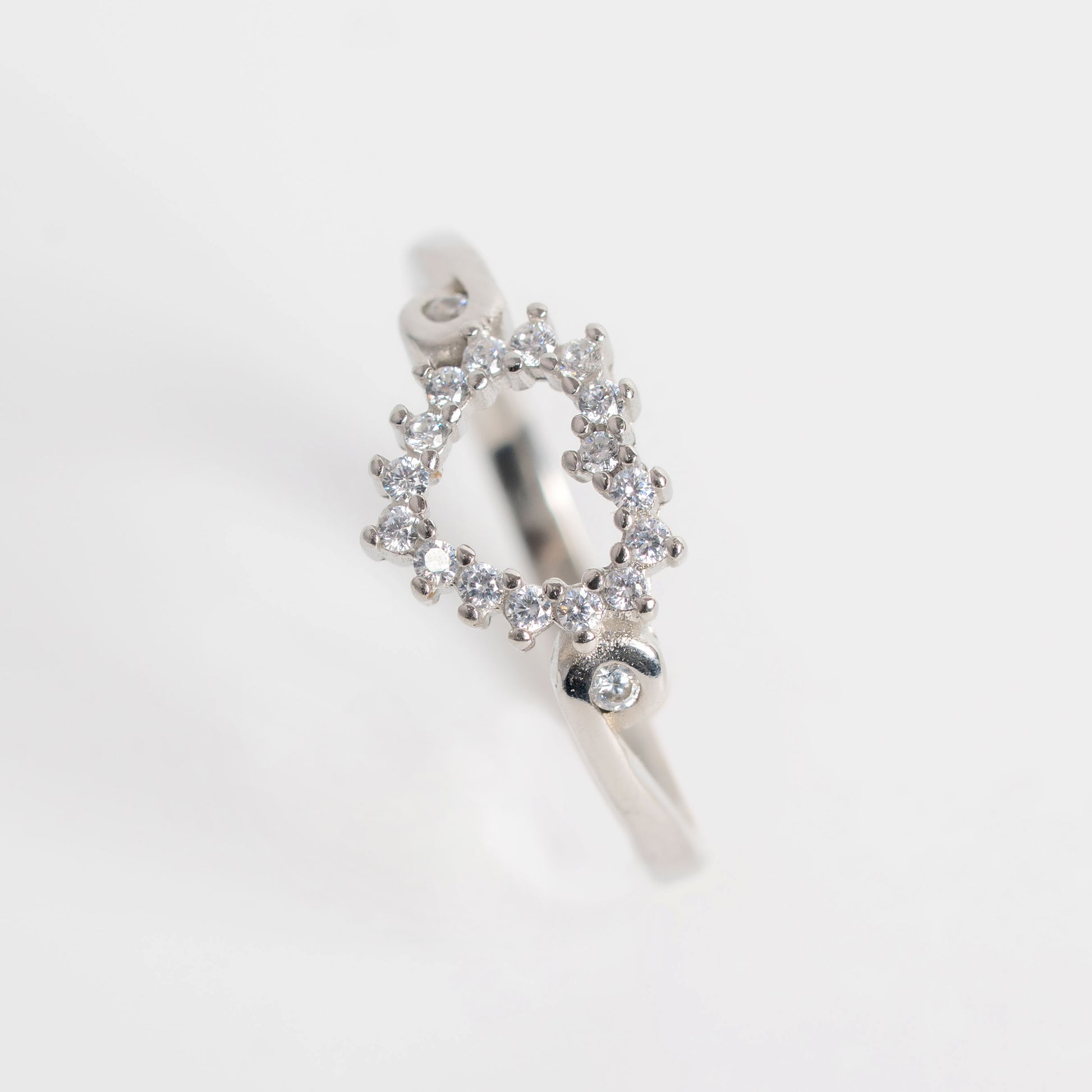 This sterling silver ring features a graceful open-heart motif, beautifully adorned with shimmering cubic zirconia stones arranged in a halo pattern. The slim, polished band adds a refined touch, while the smooth contours ensure a comfortable fit for daily wear or special occasions.