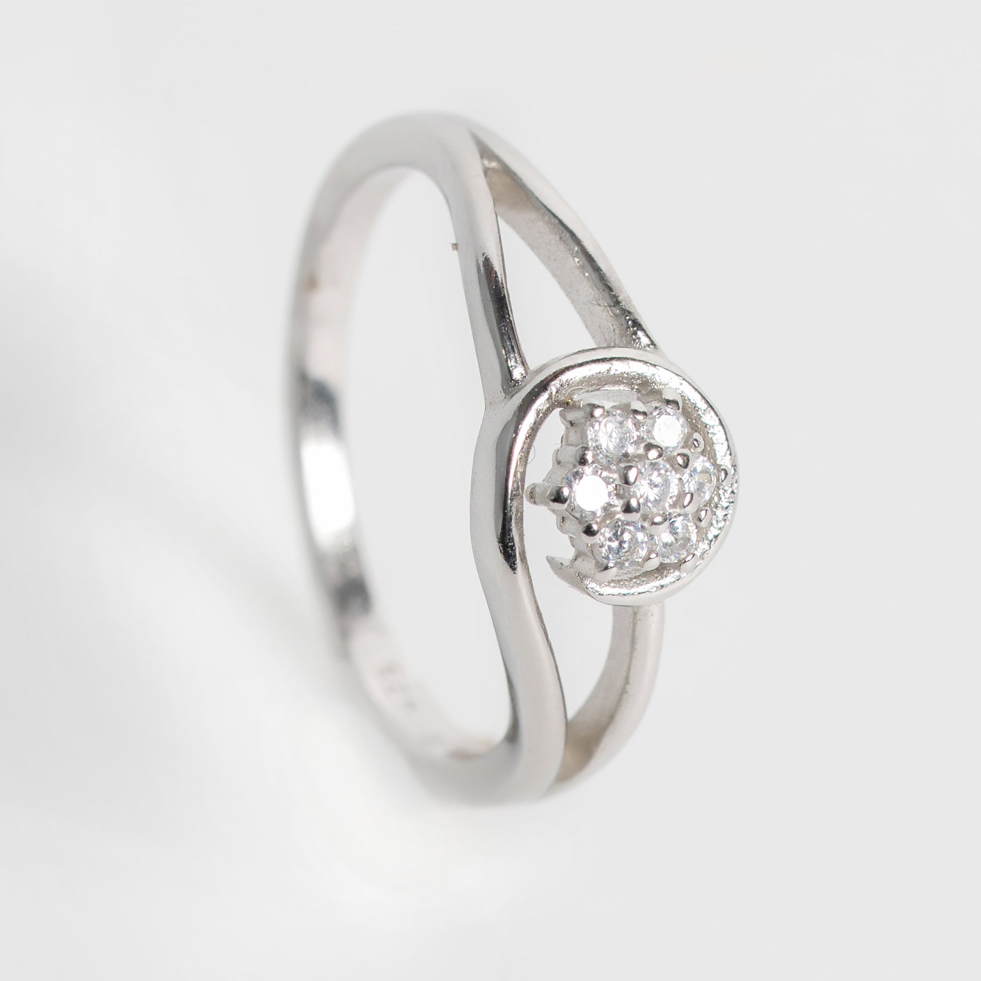 This elegant silver ring features a stunning circular cluster of shimmering stones set at the centre, beautifully complemented by a sleek, open-style band. The refined silhouette and polished finish make it a perfect choice for both everyday wear and special occasions.