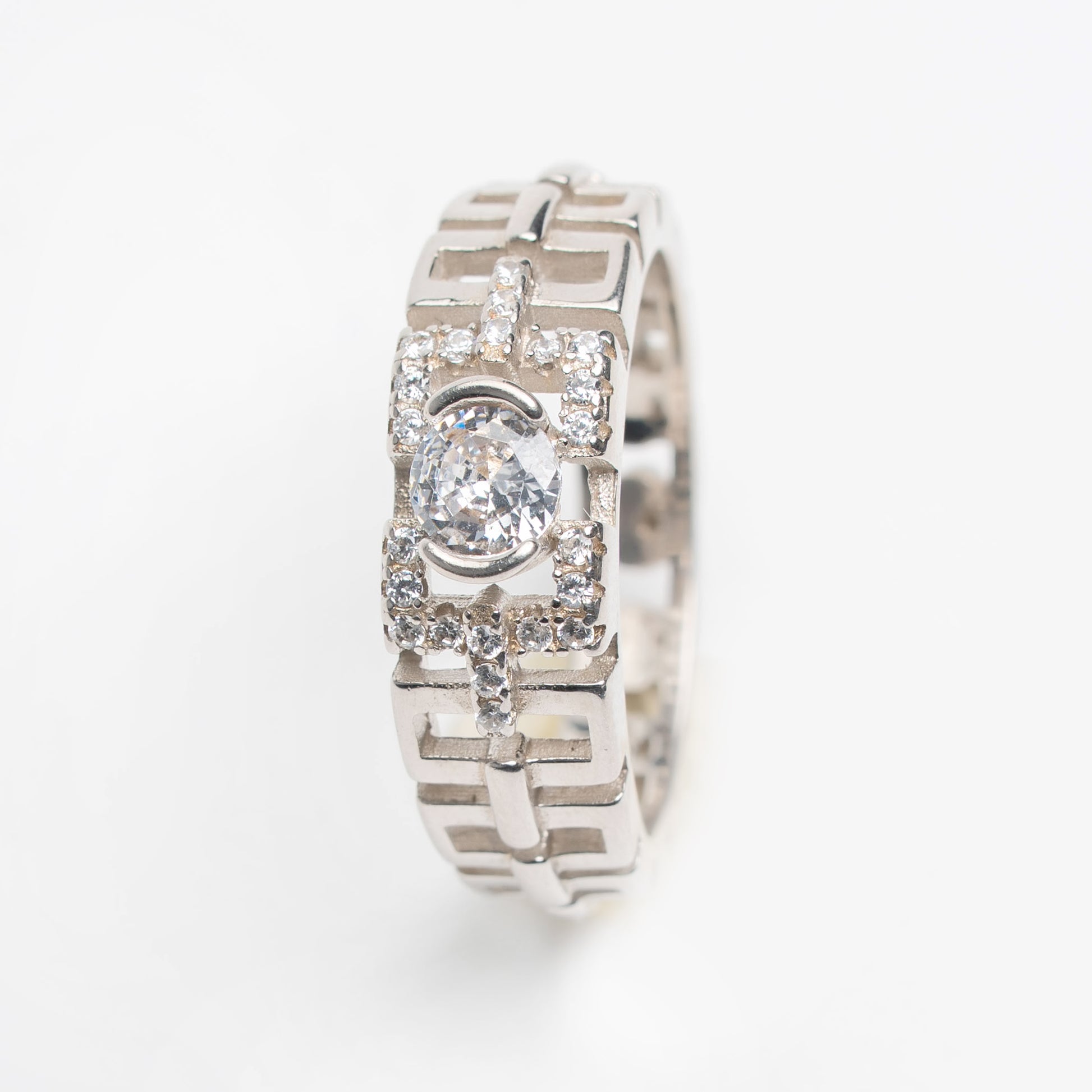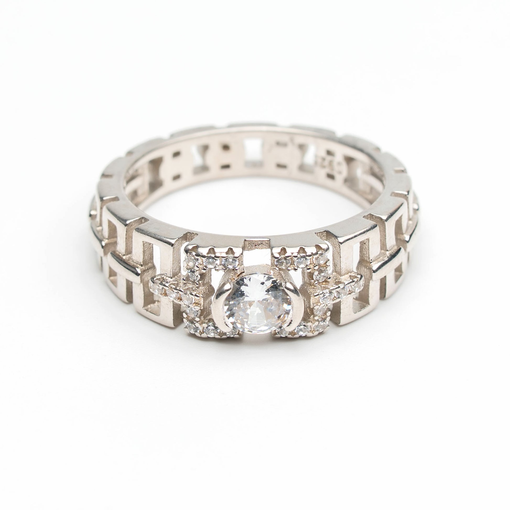 This silver ring features a beautifully crafted geometric band adorned with a prominent central zircon stone, complemented by smaller sparkling stones on either side. The openwork detailing along the band adds depth and uniqueness, while the high-polish finish enhances its luxurious appeal. Designed for both comfort and durability, it is perfect for everyday wear as well as special occasions.
