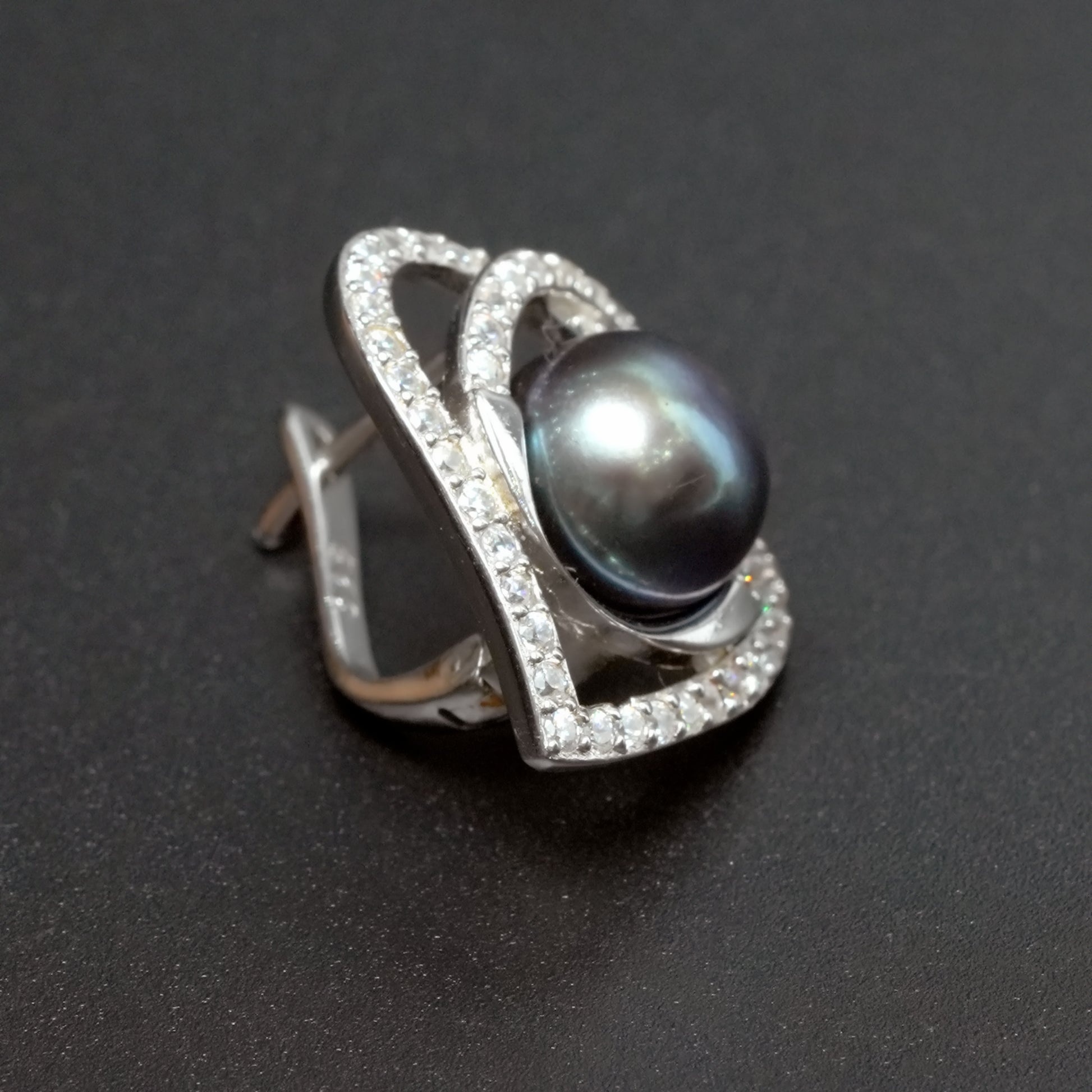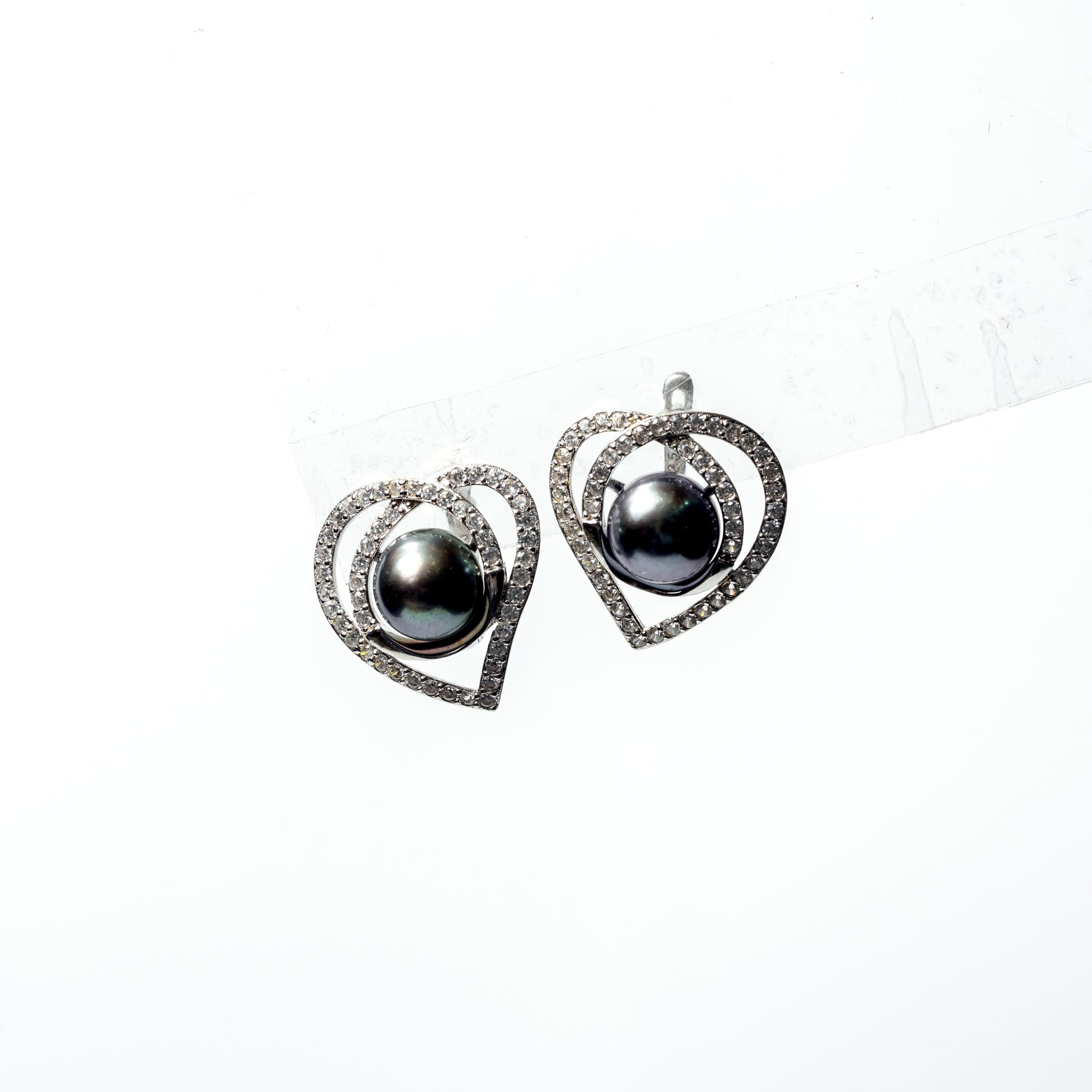 The Design: This is a stunning pair of earrings designed in a double heart shape. The outer heart is completely paved with shimmering clear stones, catching the light with every movement. Centered within the heart is a single, dramatic dark pearl (likely black or deep grey), creating an elegant and sophisticated contrast against the sparkle. They feature a secure closure (likely a leverback or post back, depending on the reverse side) and sit beautifully close to the ear.