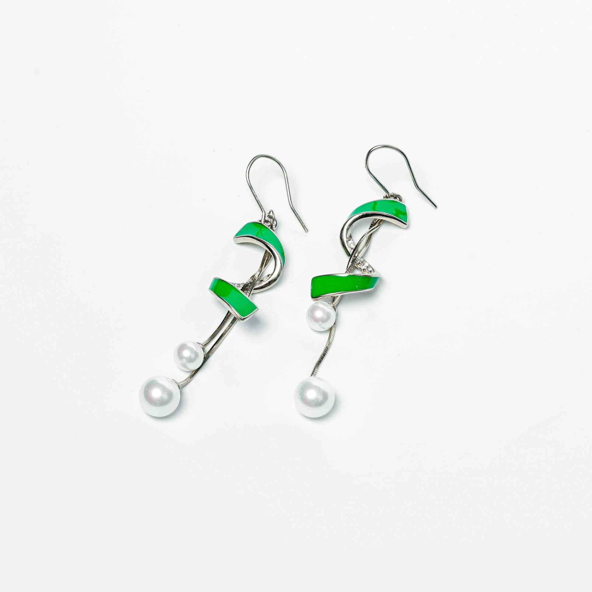Green Enamel & Pearl Spiral Drop Earrings in Sterling Silver
