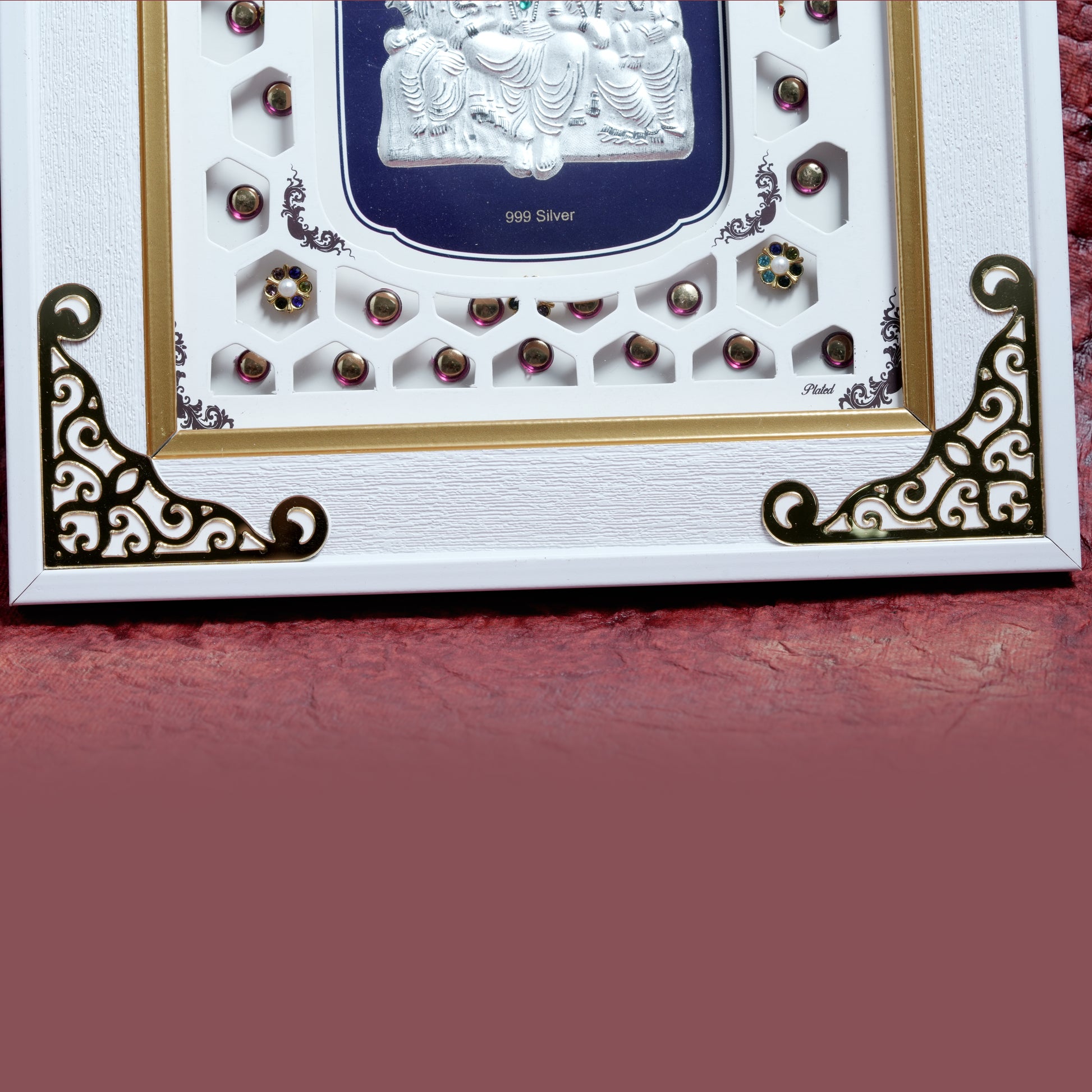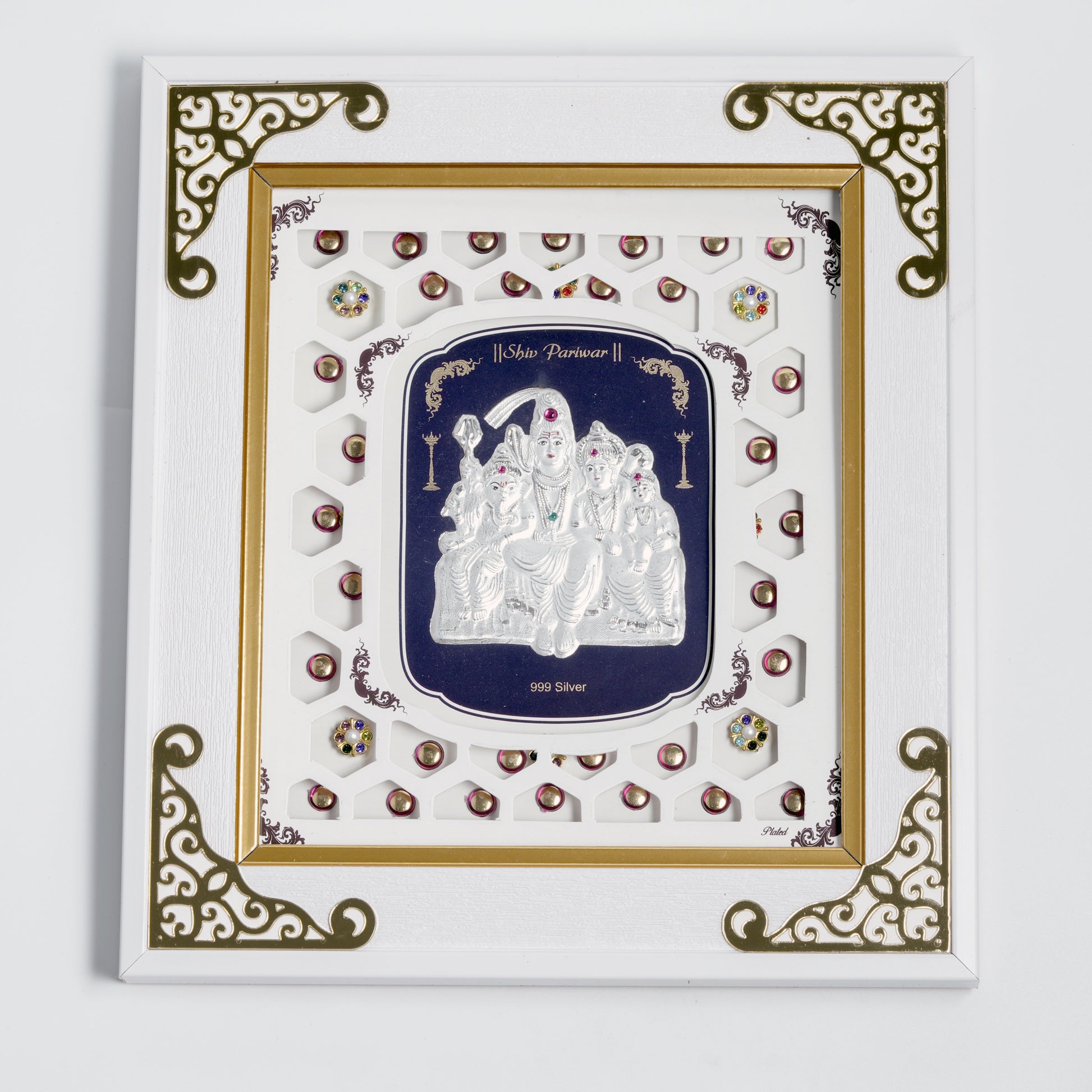 The deity figures are finely embossed in 925 sterling silver, enhanced with elegant detailing and a rich contrasting background. The premium white and gold decorative frame, accented with artistic embellishments, adds a regal and spiritual touch, making it a perfect statement piece for your home or workplace.