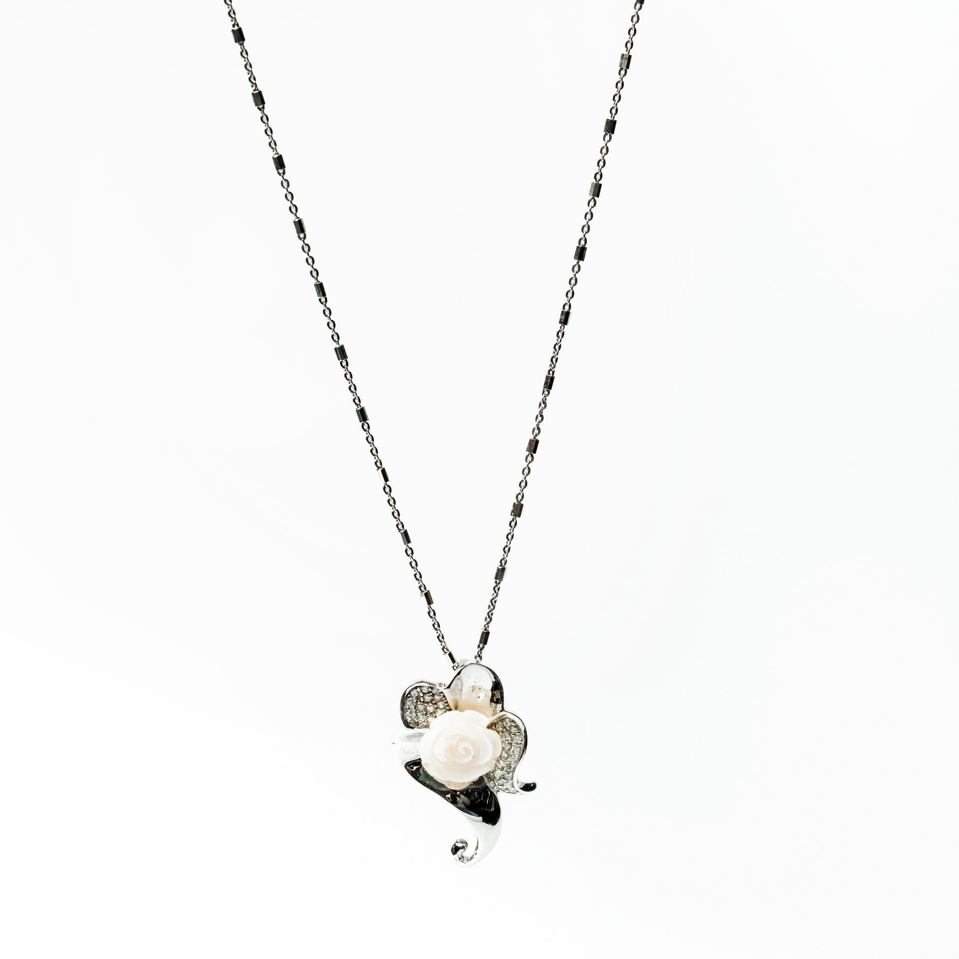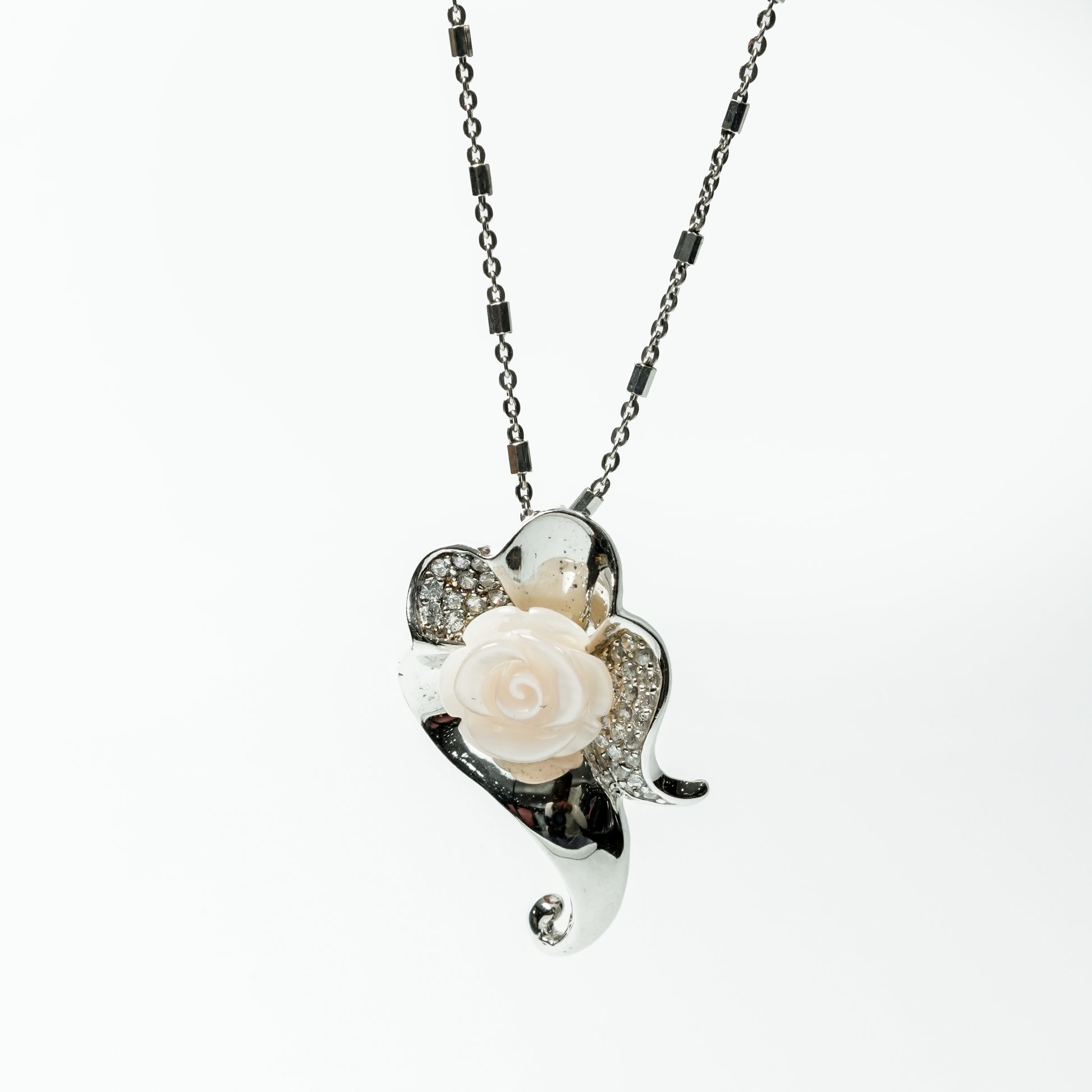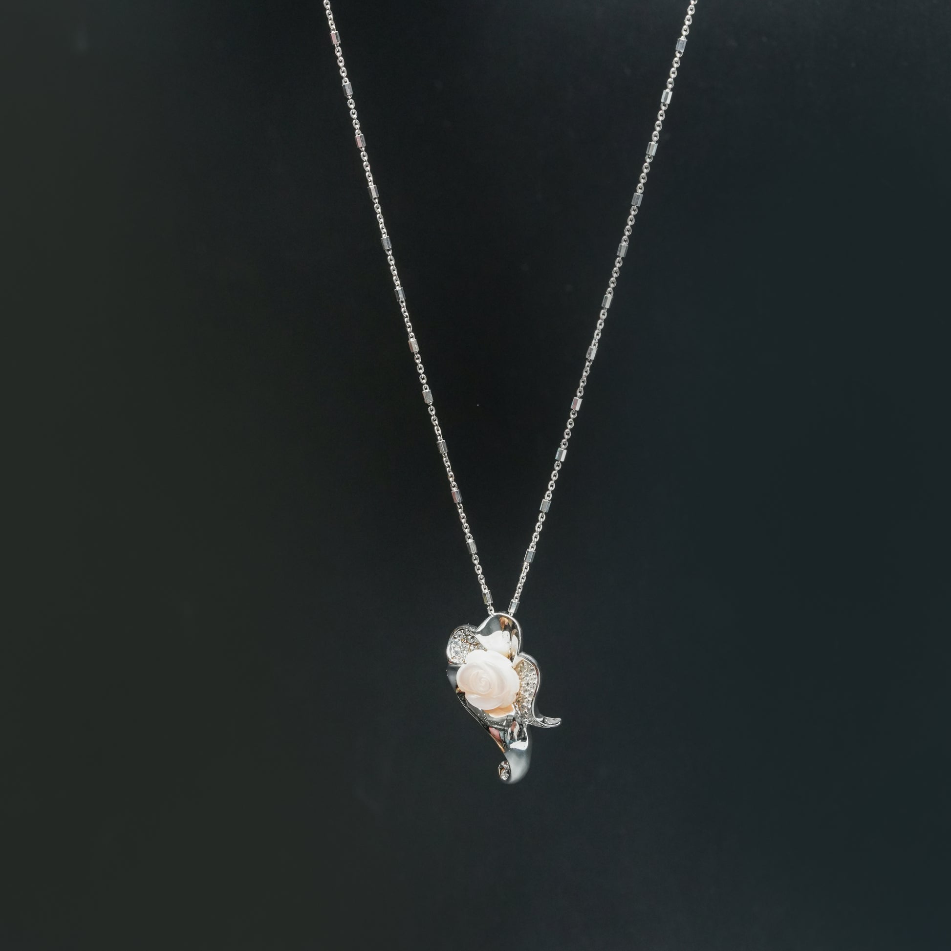 This silver pendant necklace showcases a delicately carved ivory-toned rose motif, set within flowing silver curves accented with shimmering stones. The graceful silhouette adds movement and sparkle, making it an elegant statement for everyday wear or special occasions.