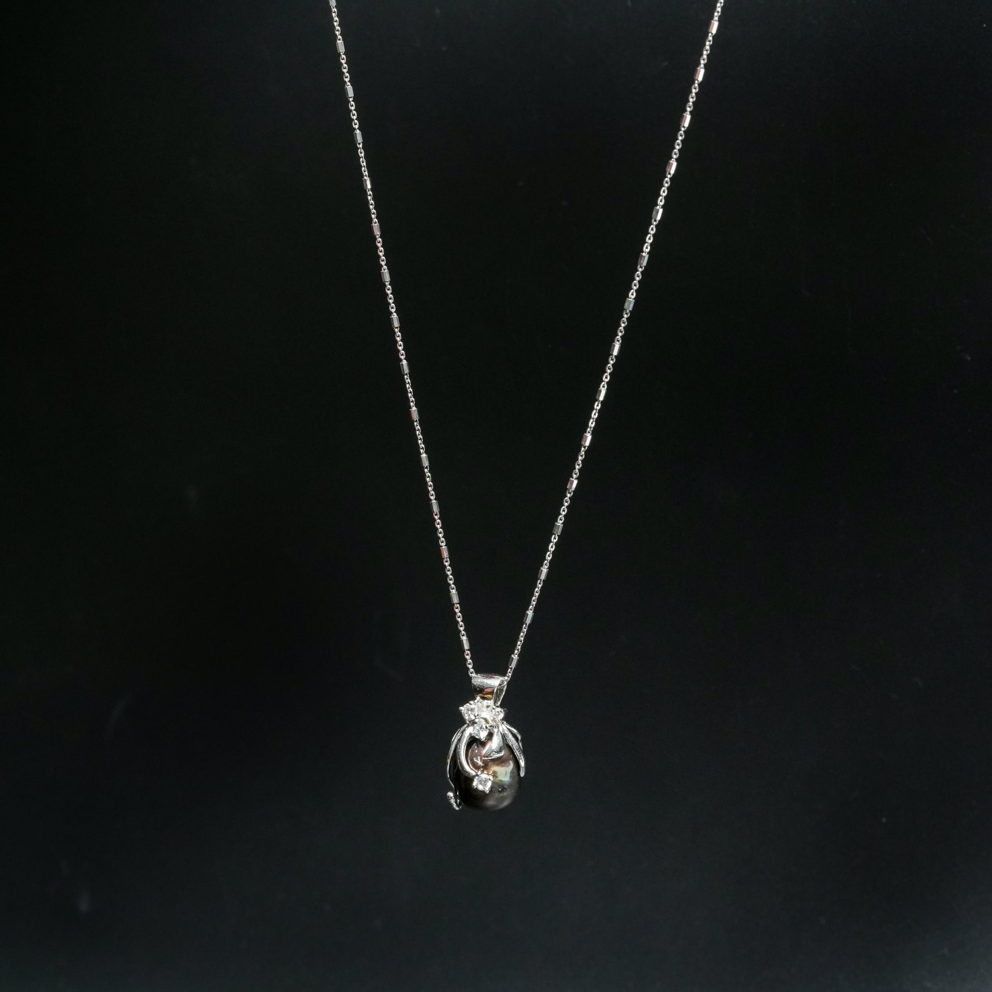 This silver pendant necklace features a deep-toned natural pearl with rich iridescence, cradled in an artistic vine-inspired silver setting. Sparkling stone accents add subtle brilliance, making it a refined statement piece for both day and evening wear.