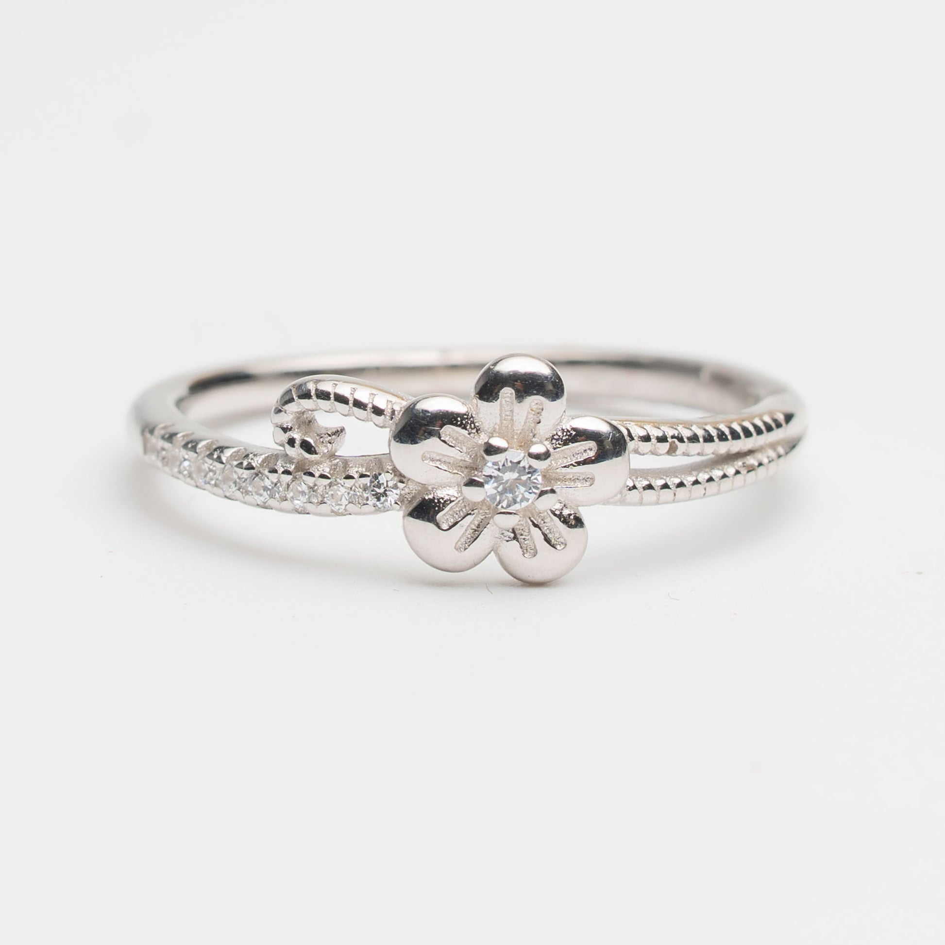 This silver ring features a beautifully crafted flower motif with a sparkling zircon stone set at the center. The slim band is enhanced with fine textured detailing and zircon accents, creating a perfect balance of elegance and simplicity.