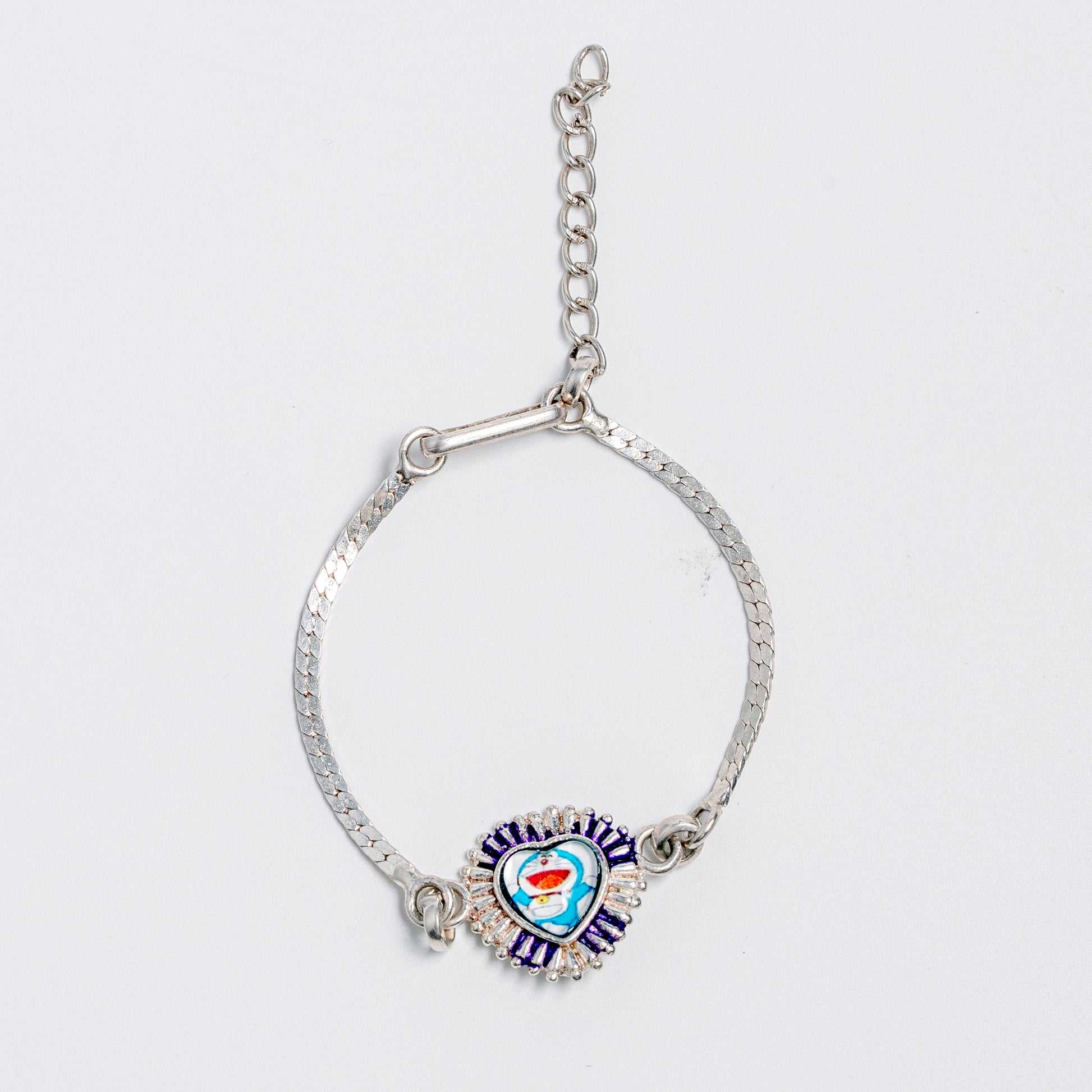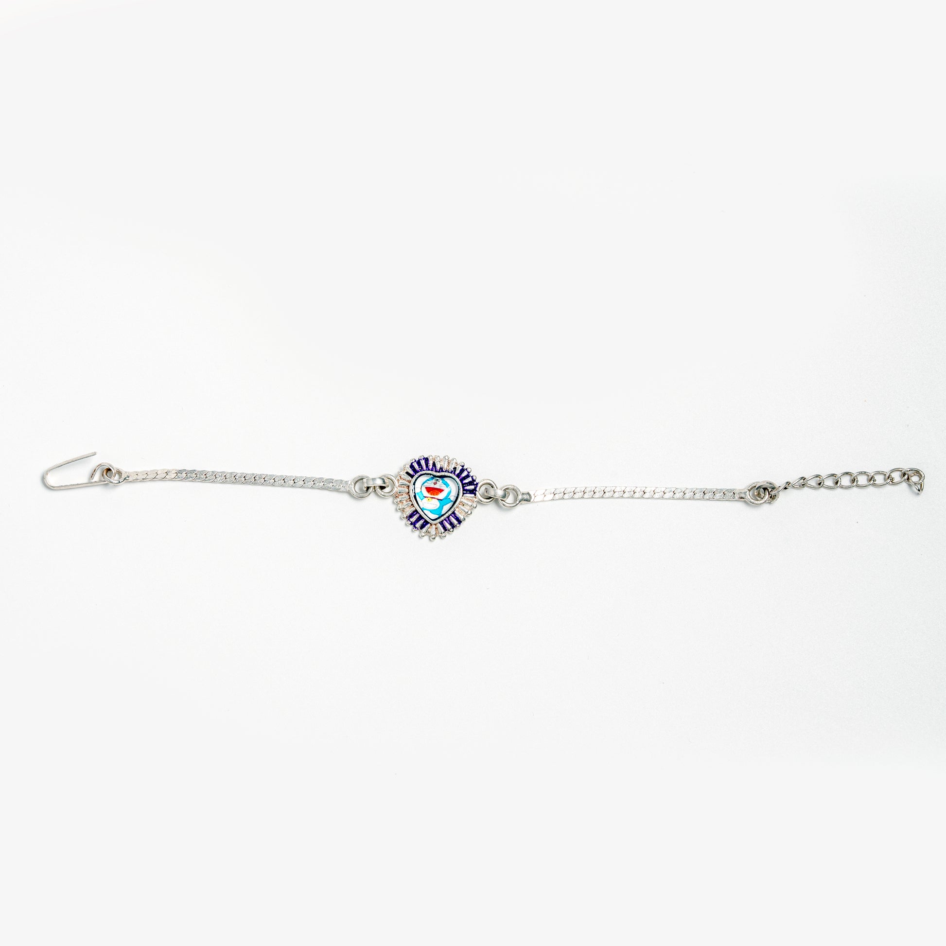 This silver bracelet features a beautifully crafted heart-shaped charm at the center, detailed with colourful enamel artwork and surrounded by delicate silver and purple-toned accents. The slim silver chain adds balance and elegance, making the bracelet light, charming, and comfortable to wear.