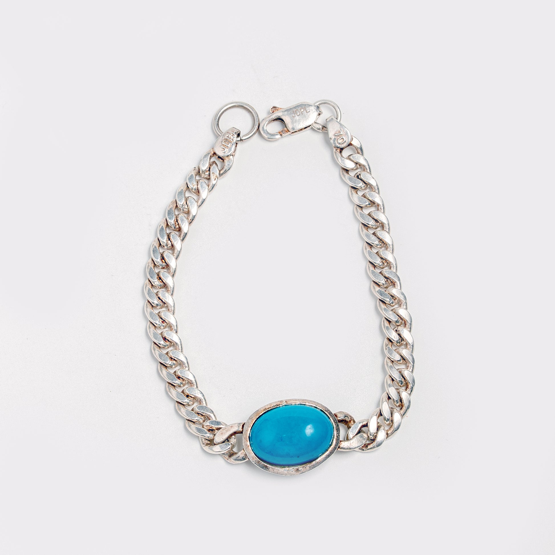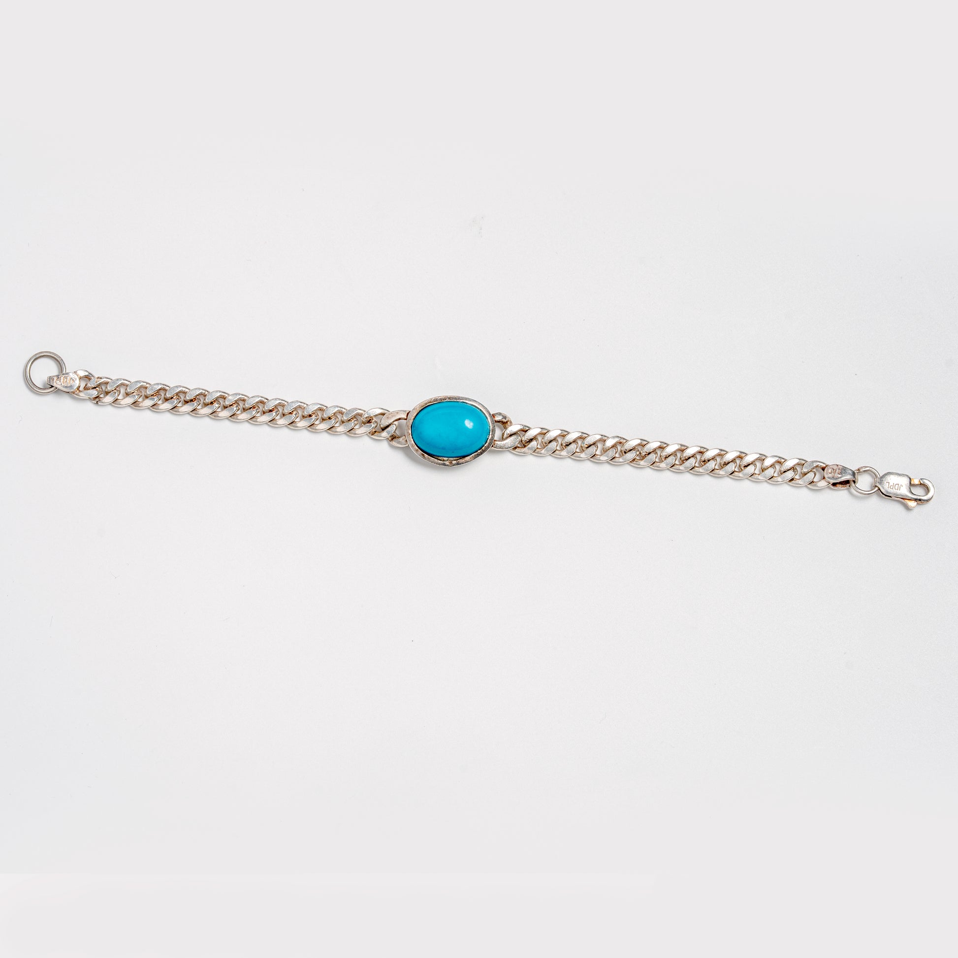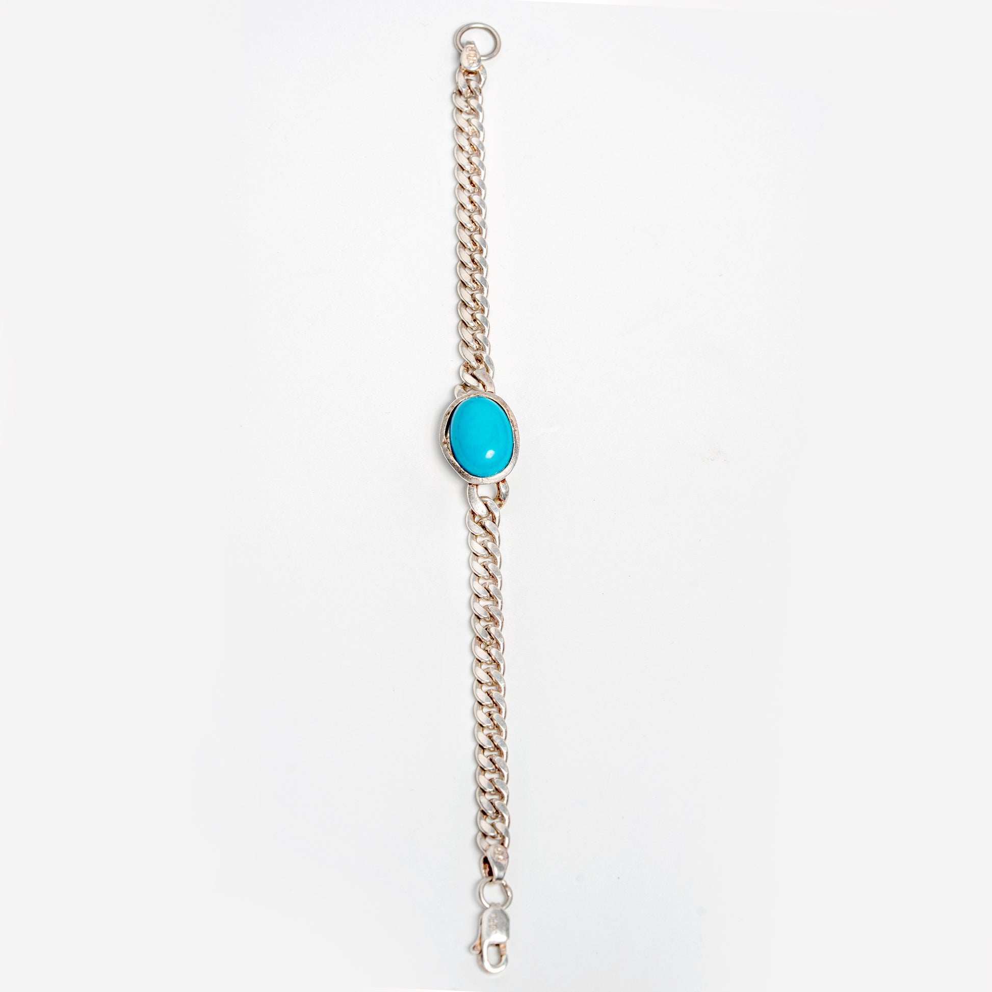 The Design: This sterling silver bracelet features a strong, polished curb chain design for a classic look. The focal point is a smooth, oval-cut turquoise stone, securely bezel-set in silver. The striking contrast between the bright silver and the vibrant blue-green of the turquoise makes this a truly eye-catching accessory.